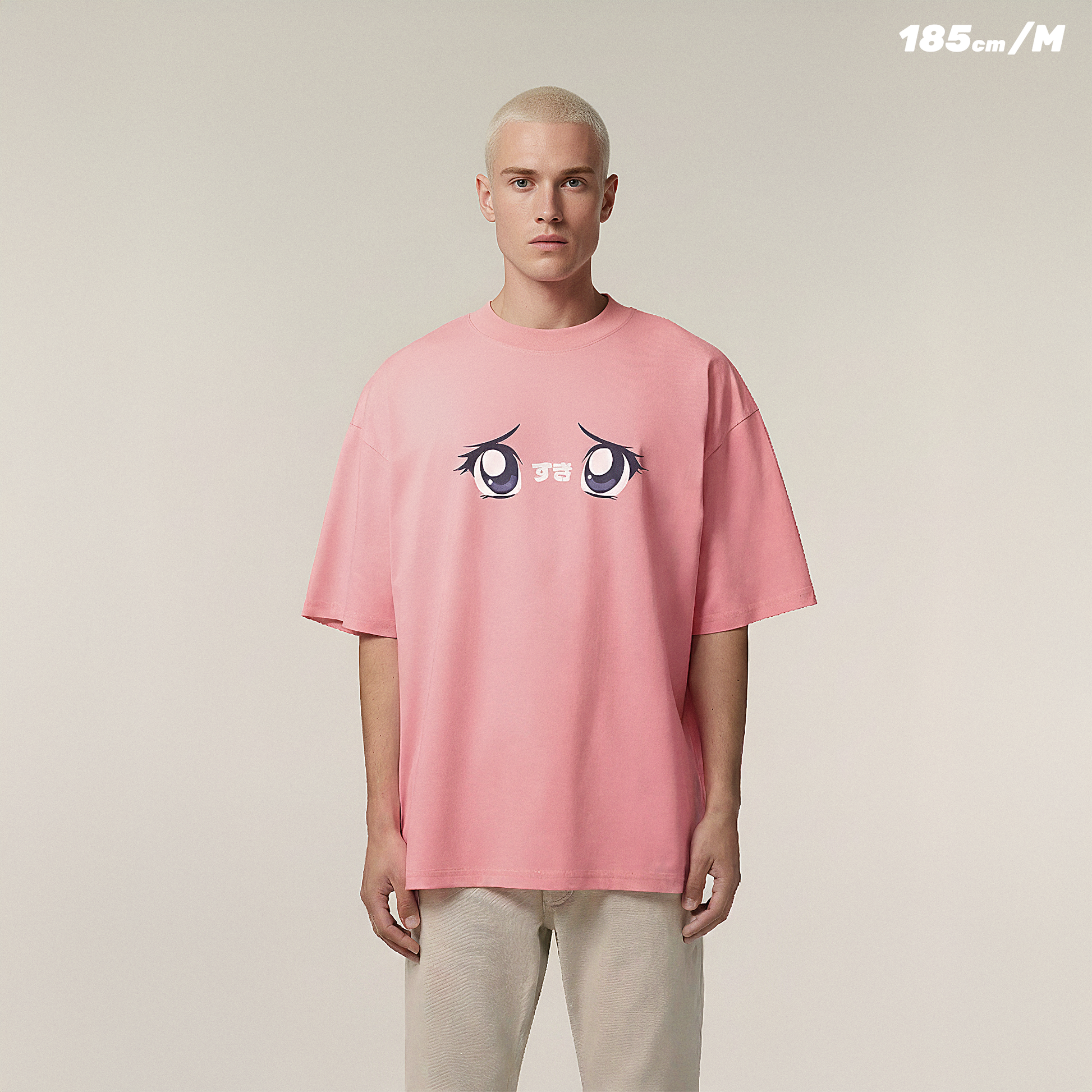 Bright bubblegum pink. Anime eyes and a love message: すき means I like you.